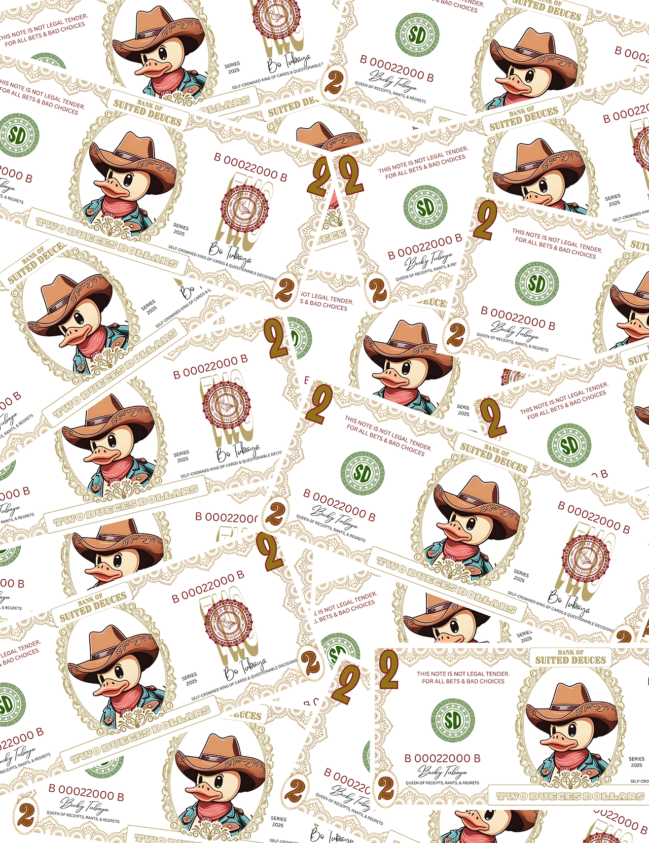 Deuces Dollars are prize vouchers you can win at Suited Deuces poker games. They’re your bonus bragging rights—redeemable for merch, prizes, and other fun stuff.